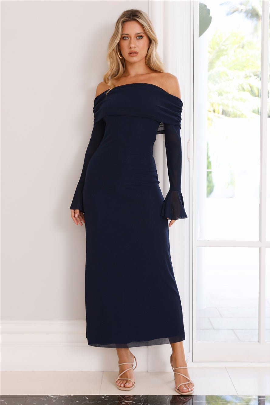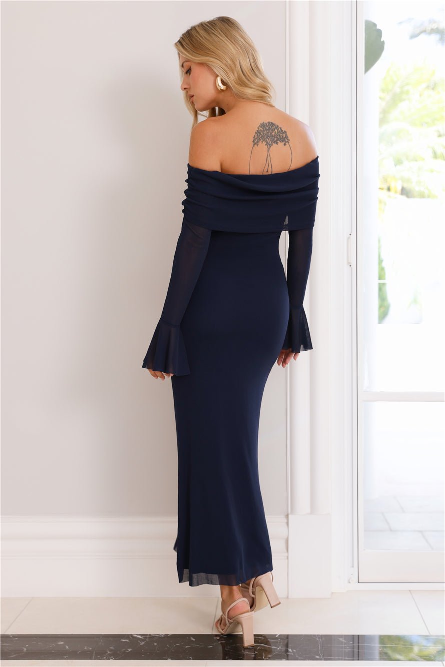 Enter the event as the best-dressed guest. The Decadence Off Shoulder Mesh Maxi Dress features a folded neckline, long sleeves with flared cuffs and an inner grip to have you feeling secure. Style with heels and curls.