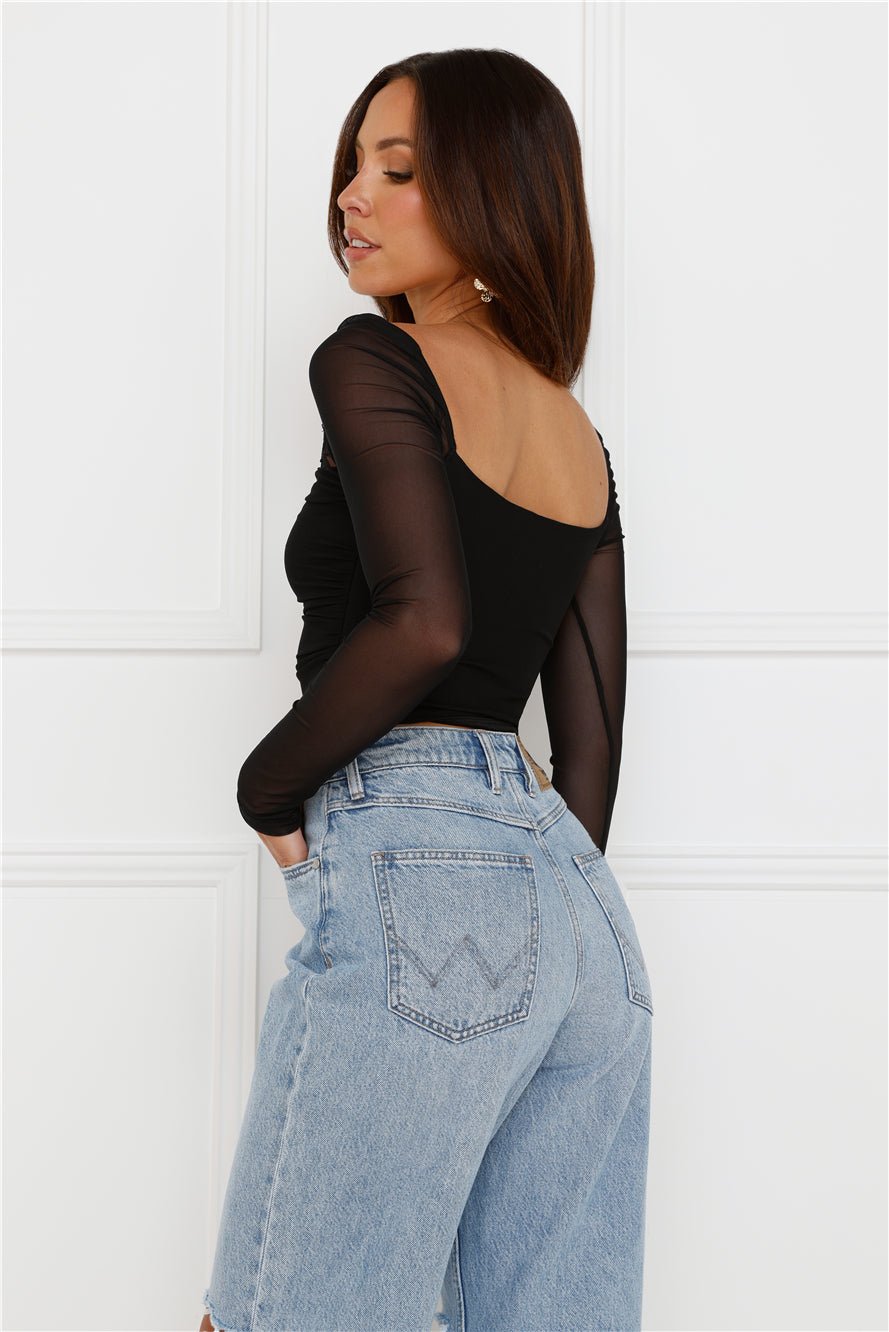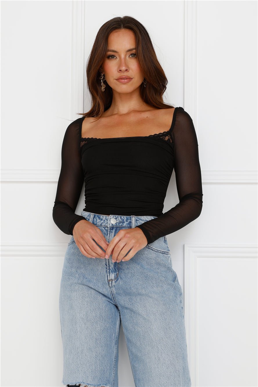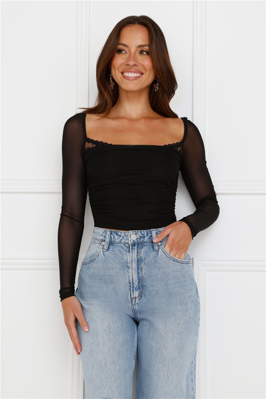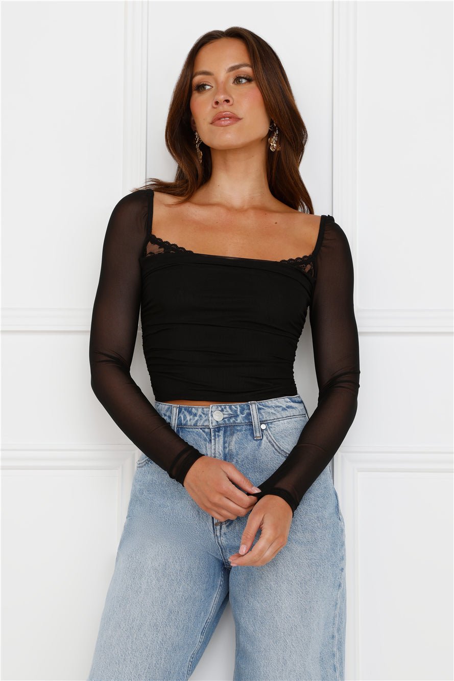 Level up your flirty vibes with the Decadent Style Mesh Long Sleeve Crop Top. Featuring a lace trim to the neckline and long sheer sleeves. Style with a skirt and boots!