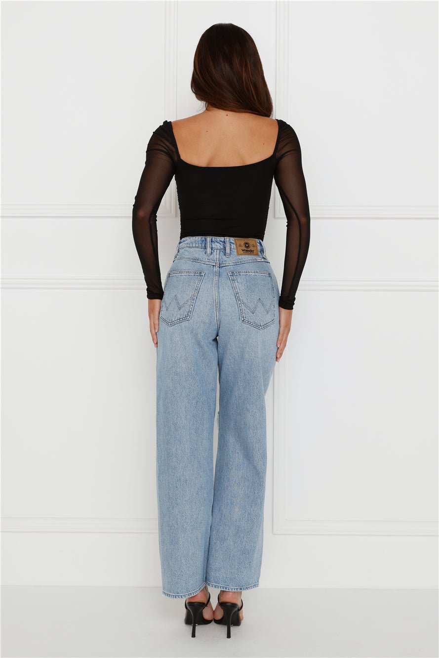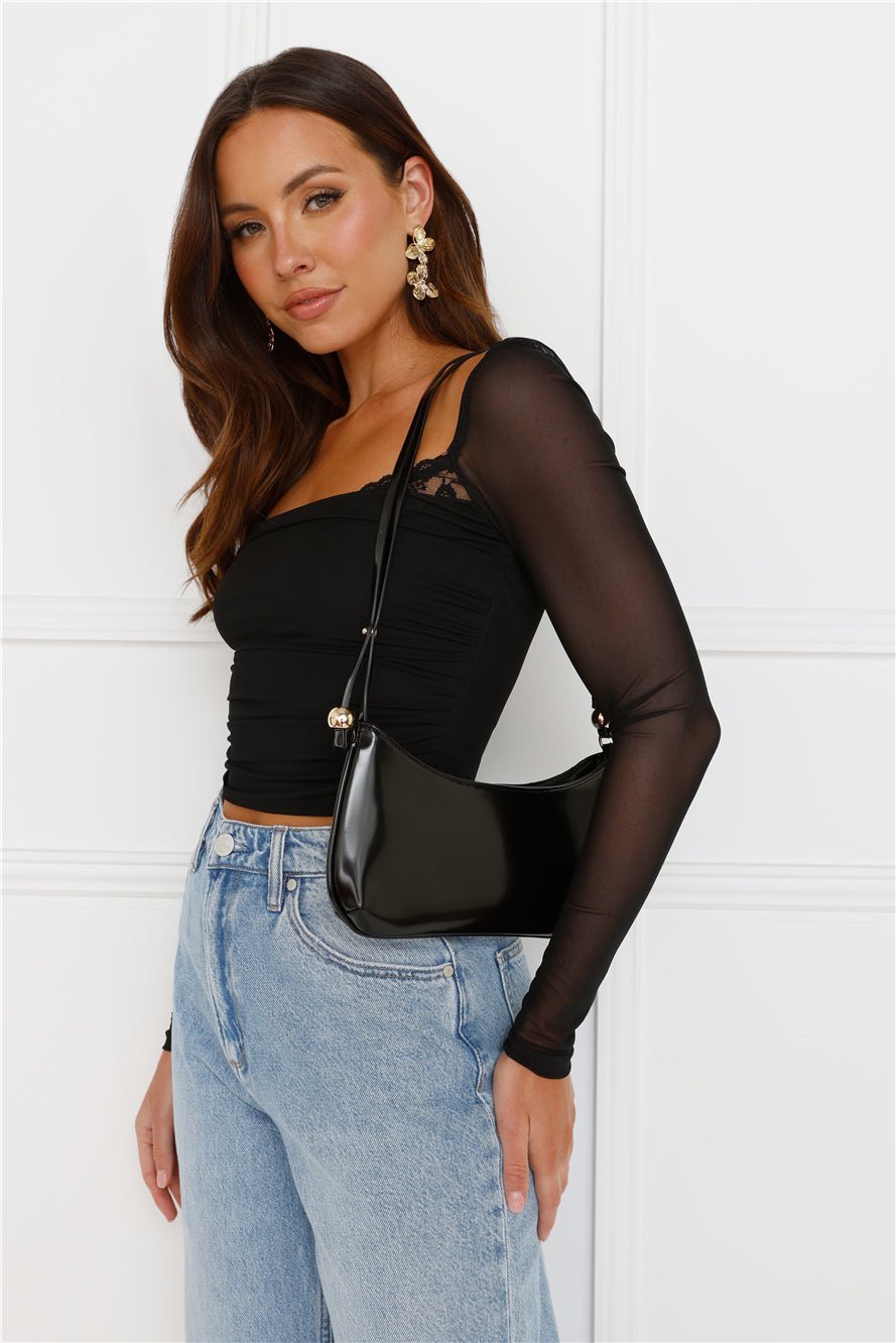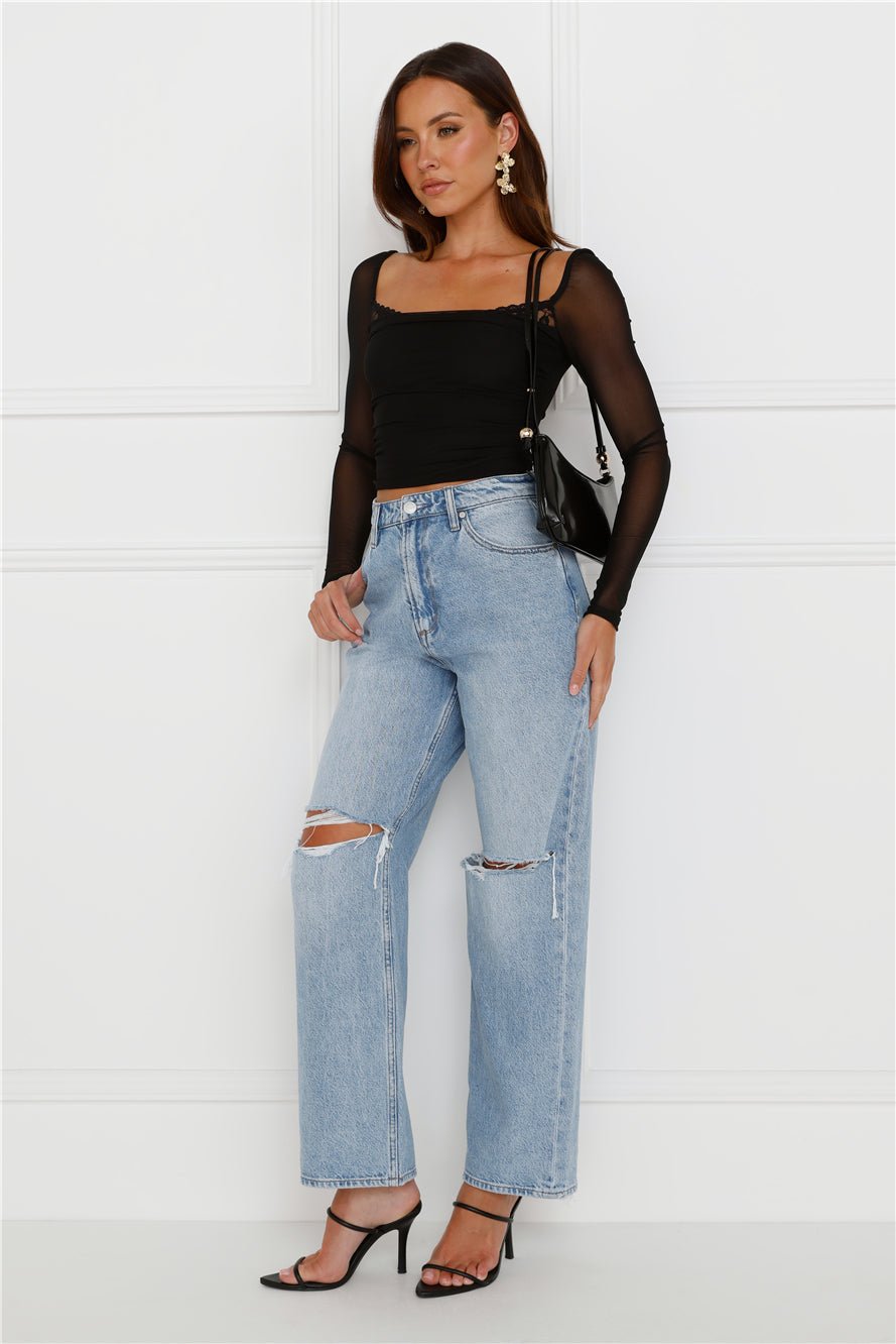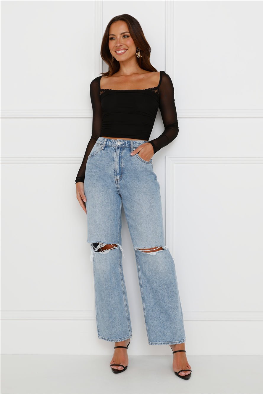 Level up your flirty vibes with the Decadent Style Mesh Long Sleeve Crop Top. Featuring a lace trim to the neckline and long sheer sleeves. Style with a skirt and boots!