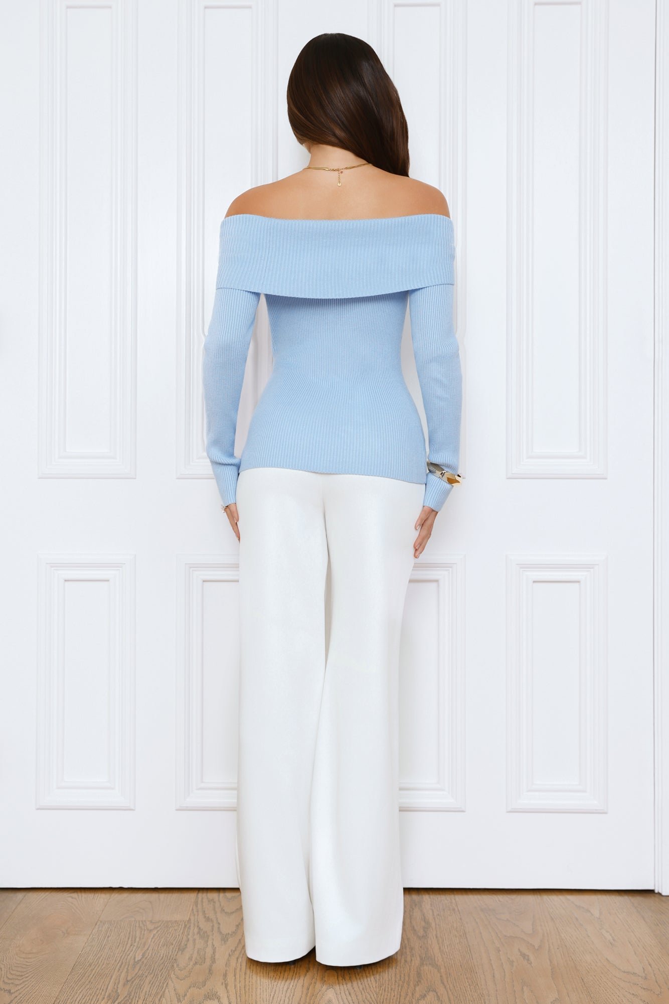 The Dreamwave Off Shoulder Knit Top Blue is your new go-to for chic off-duty styling. Designed from a soft stretch ribbed knit, it features a folded neckline that sits effortlessly off the shoulder with long sleeves for a sleek finish. Designed to slip on with ease, this top blends comfort and sophistication for day-to-night wear.