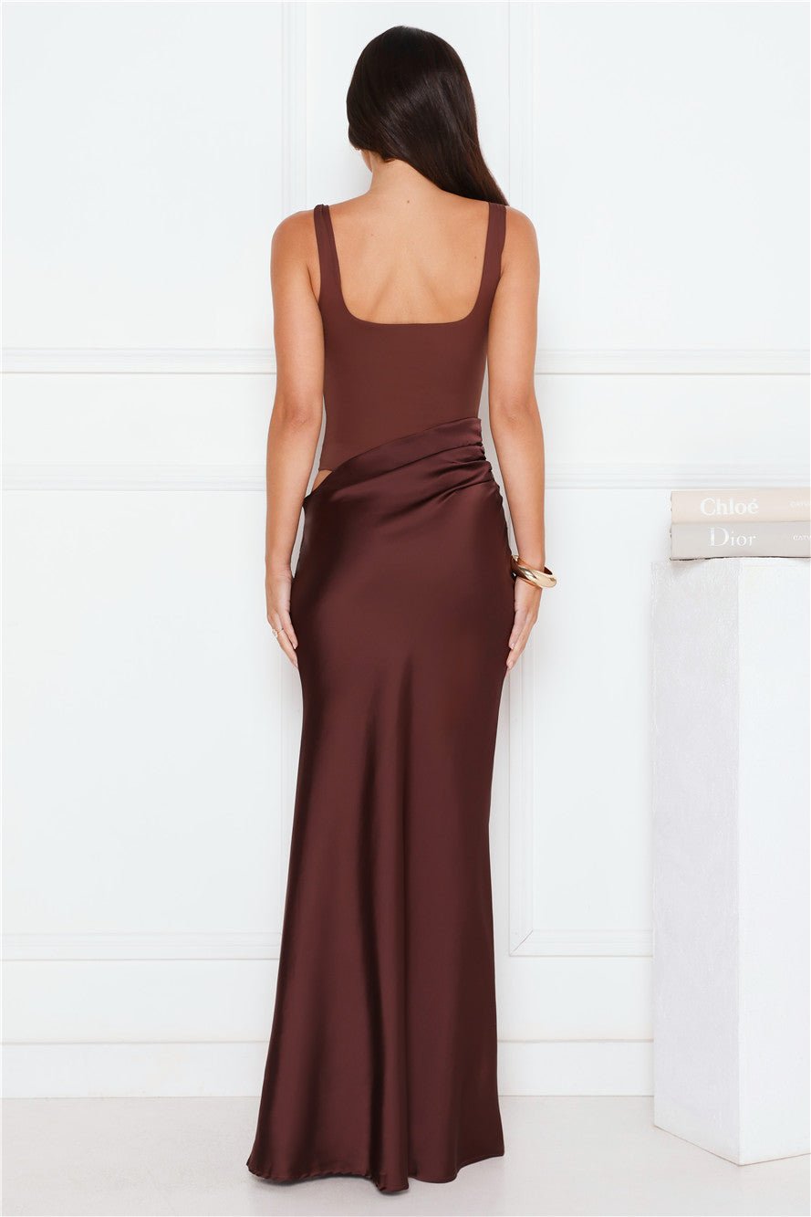 The Effortlessly Yours Satin Maxi Dress features a stretch bodysuit-style top with convenient snap closures, a flowing satin skirt and a slit to the waist. Style with heels.Â