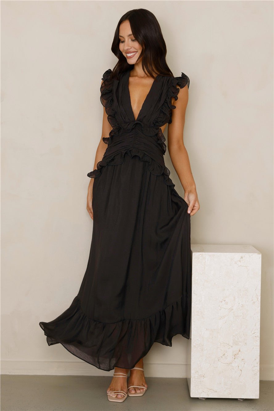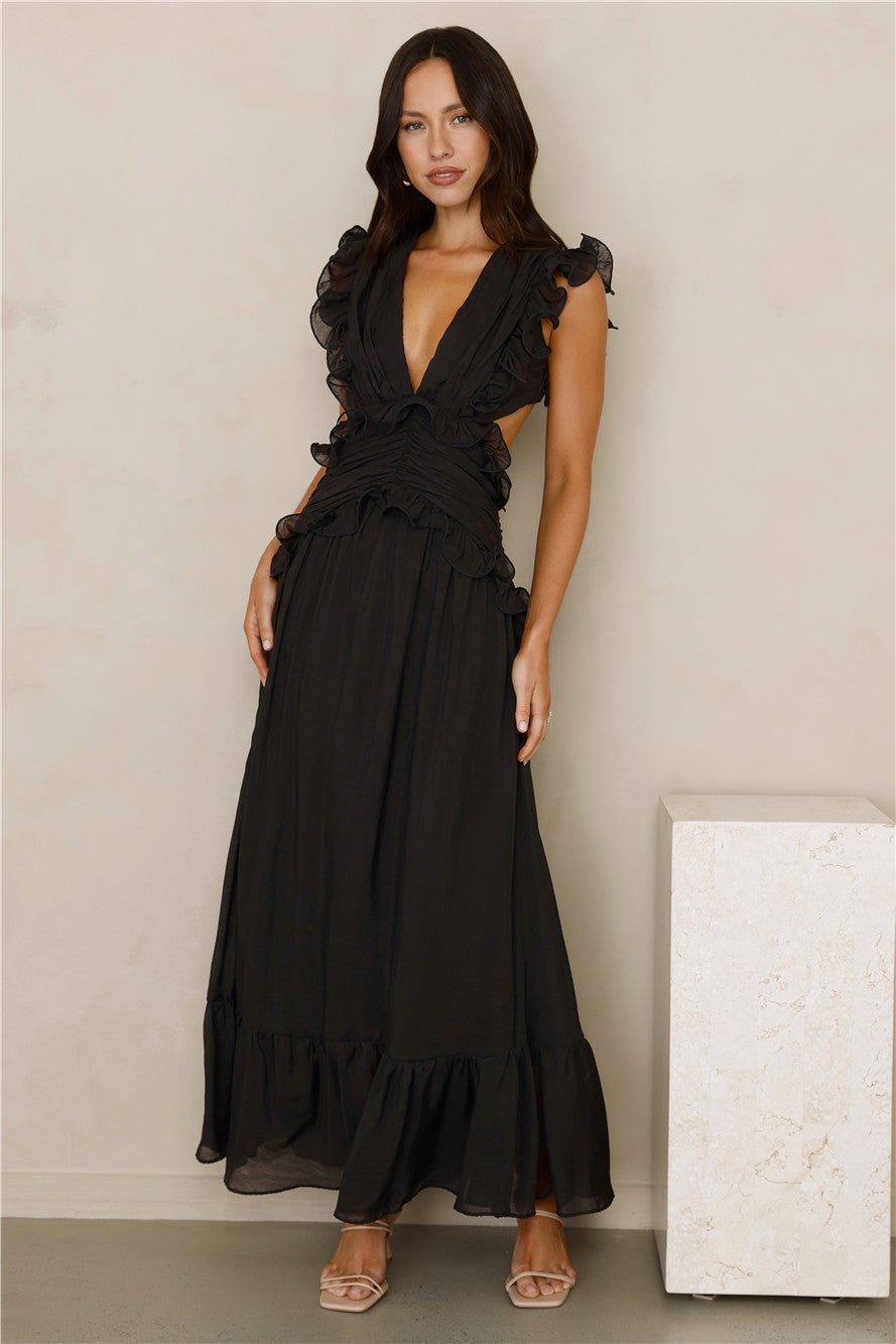 The Evening Luxe Maxi Dress features a stunning cutout to the waist, delicate frill details, a flowy skirt, and an open back, making it perfect for an elegant night out. Style with heels and sparkly accessories.Â