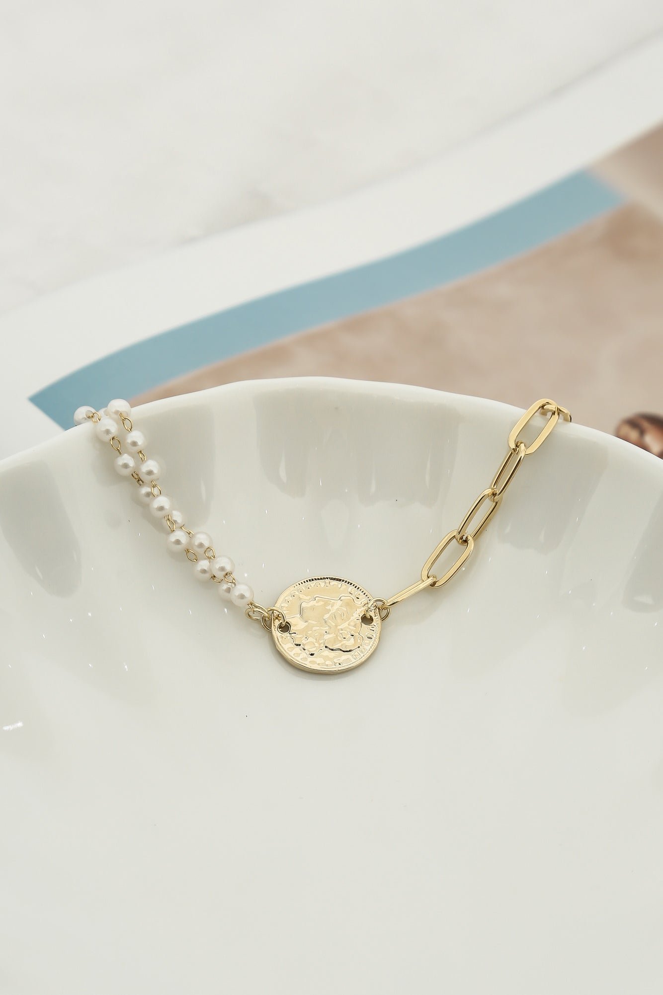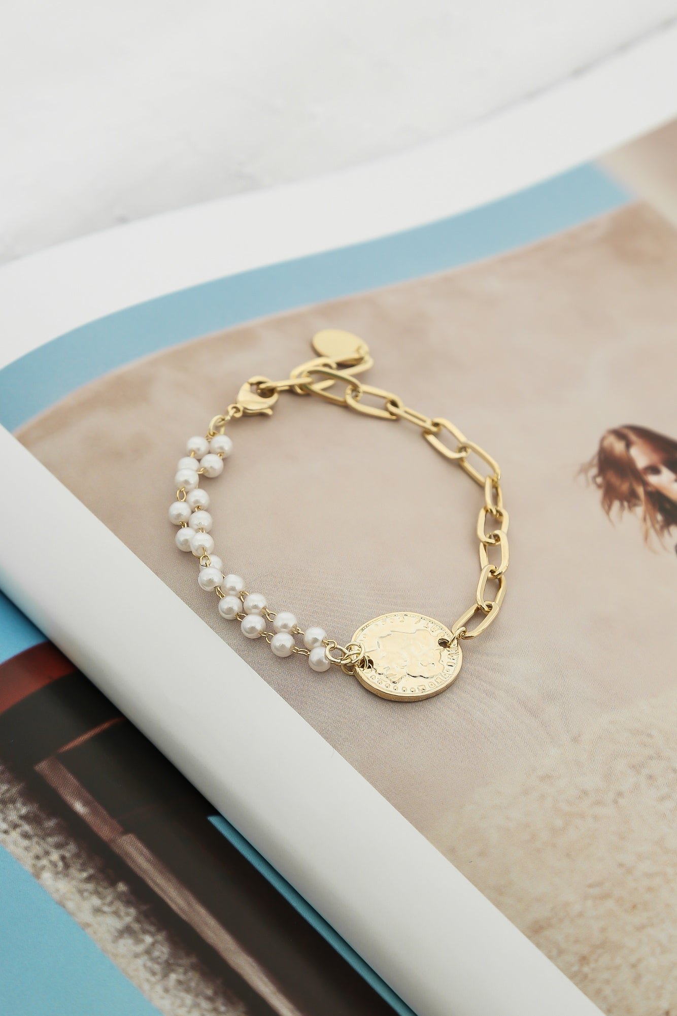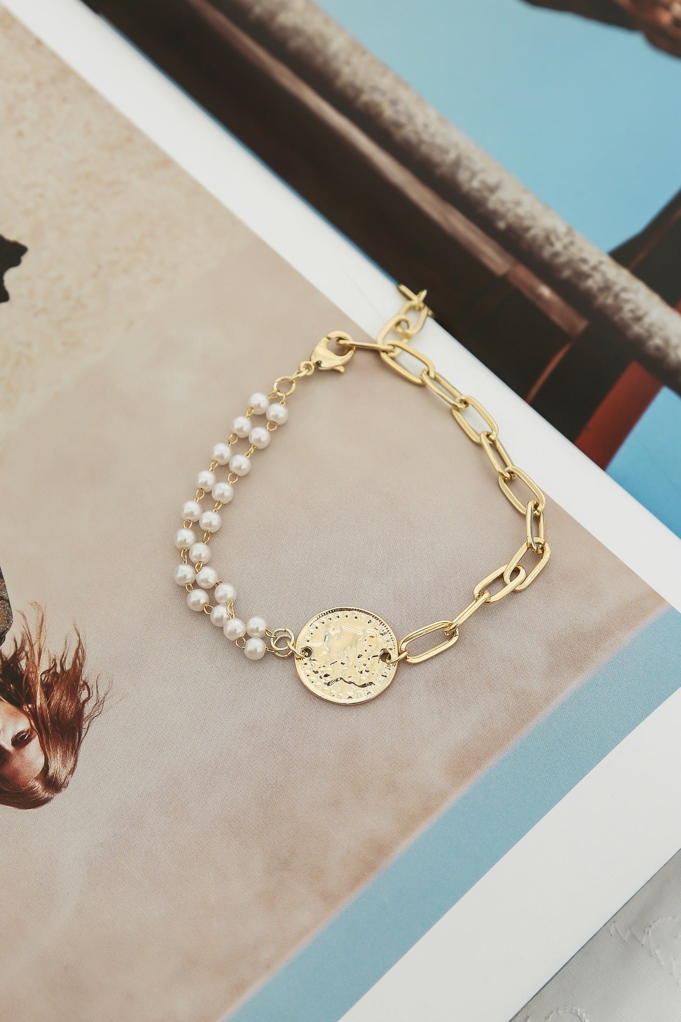 - Gold coin pendant bracelet.