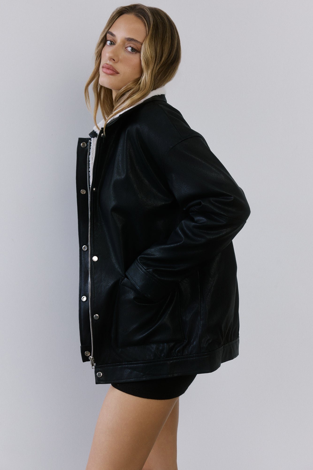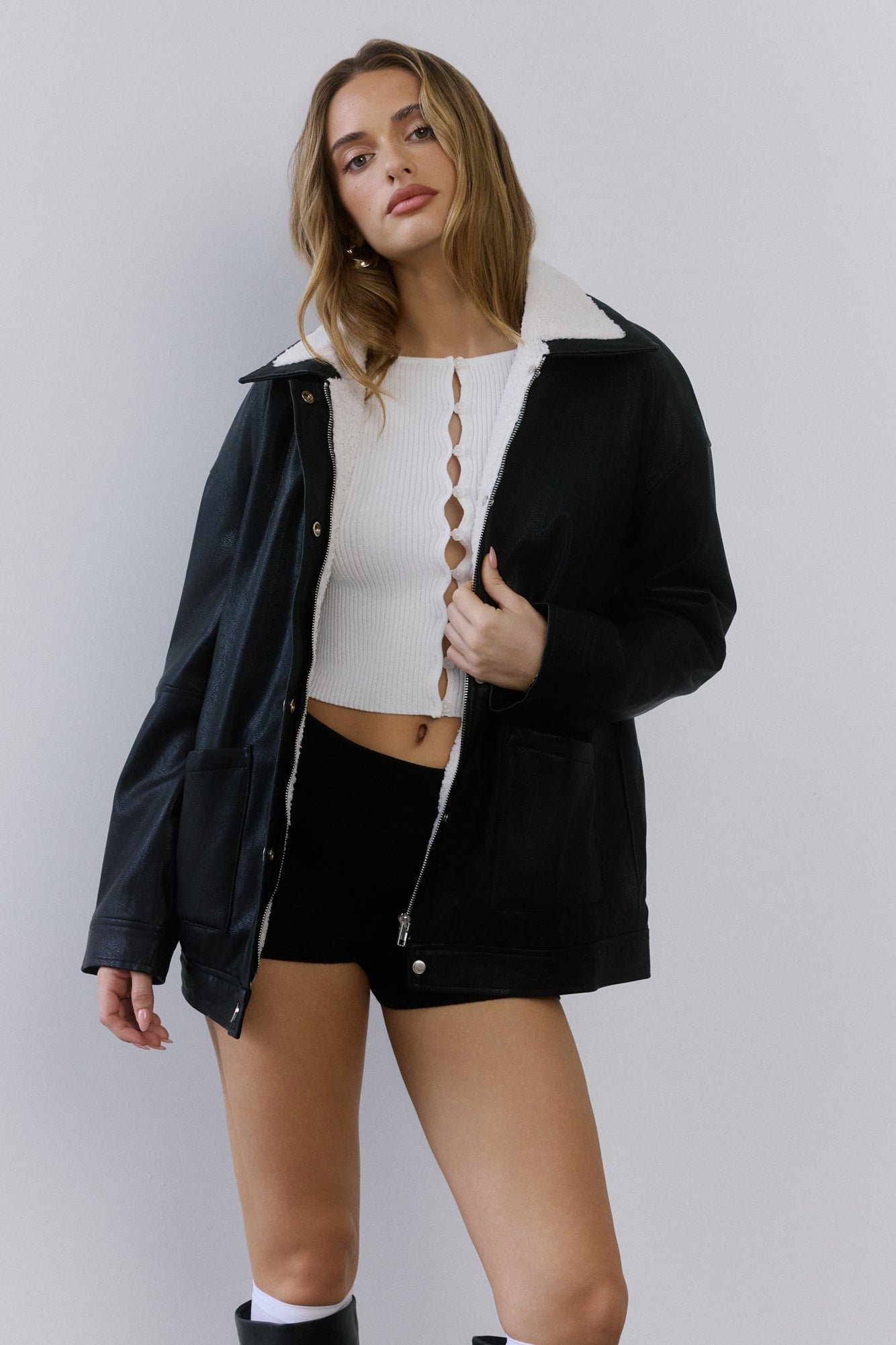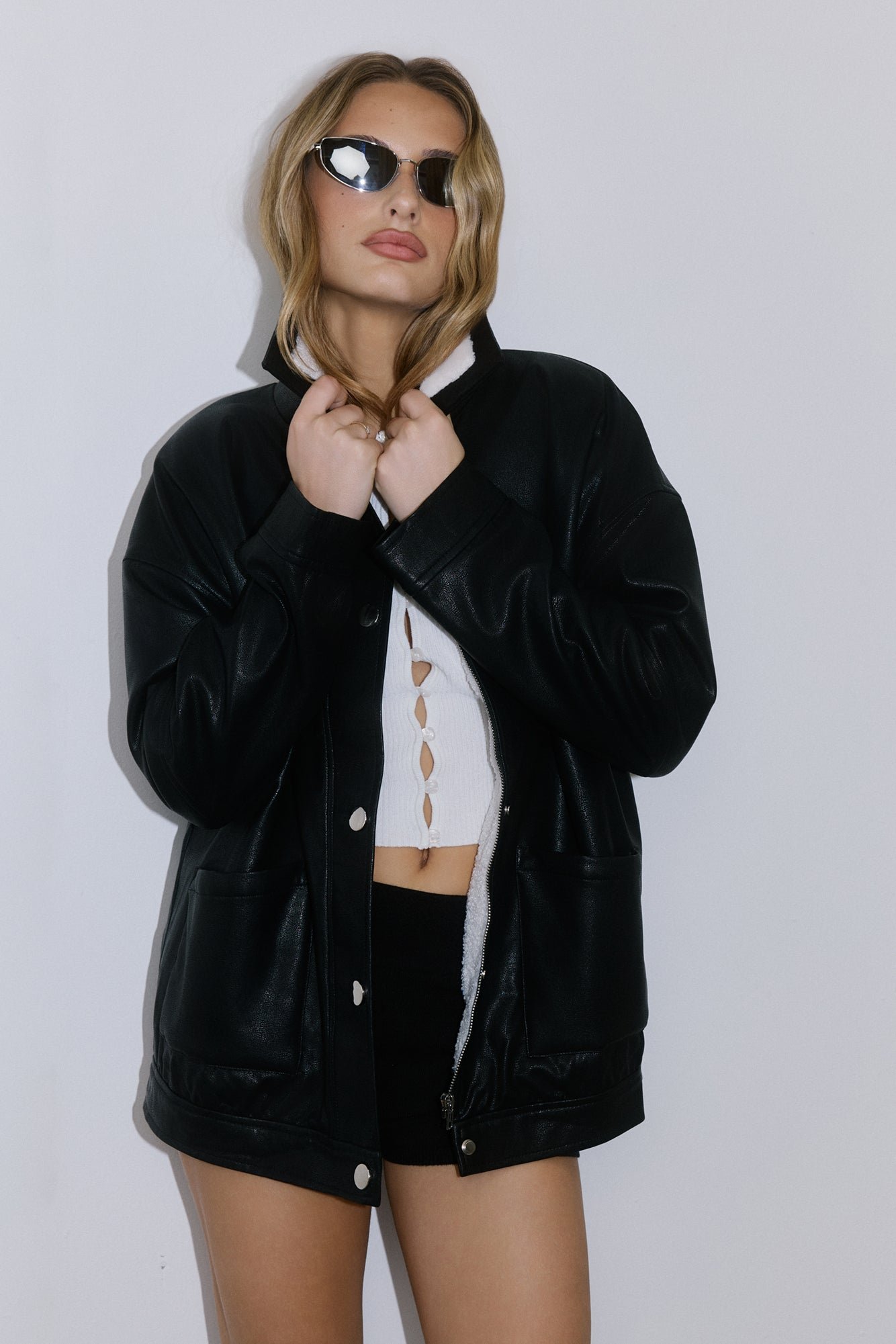 Cool girl edge meets cosy vibes. The Midnight Snow Faux Leather Biker Jacket is lined with plush faux shearling, finished with front pockets, and detailed with both a button and zipper closure for that effortlessly look. Throw it over anything for instant it-girl energy!