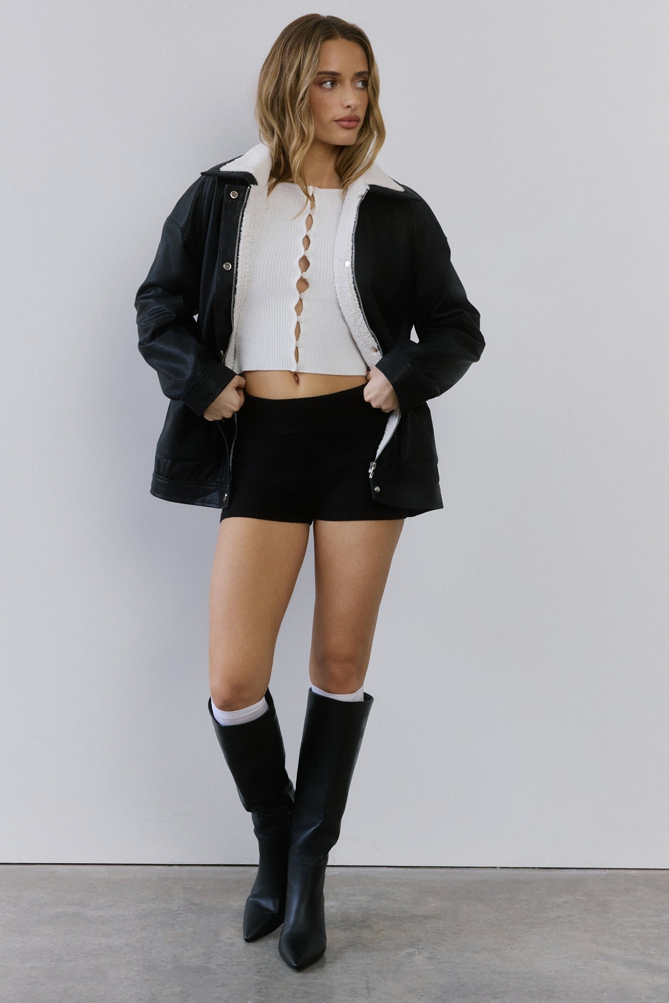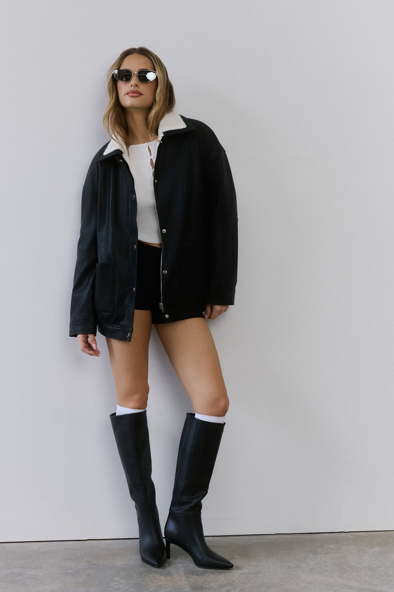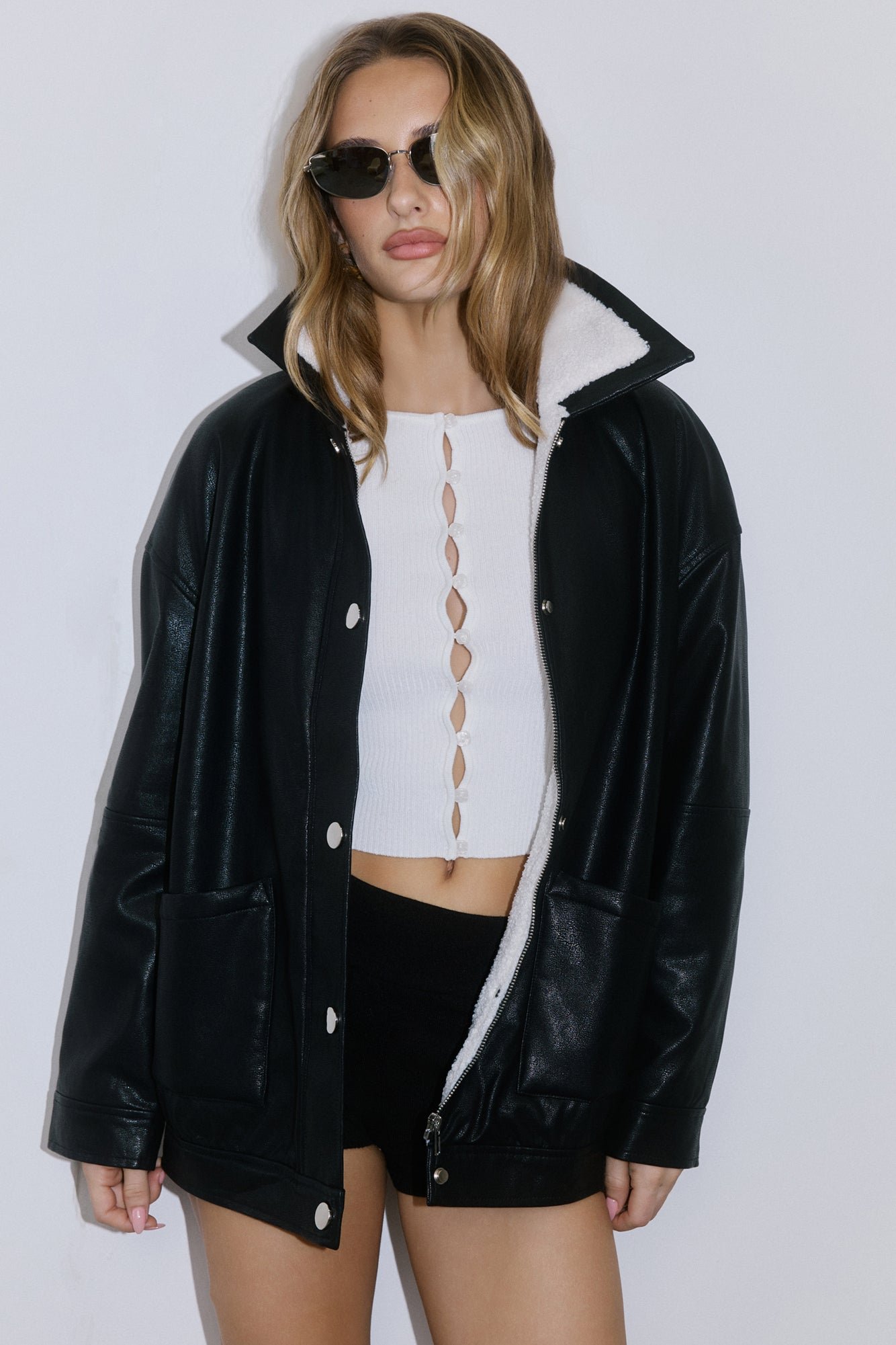 Cool girl edge meets cosy vibes. The Midnight Snow Faux Leather Biker Jacket is lined with plush faux shearling, finished with front pockets, and detailed with both a button and zipper closure for that effortlessly look. Throw it over anything for instant it-girl energy!