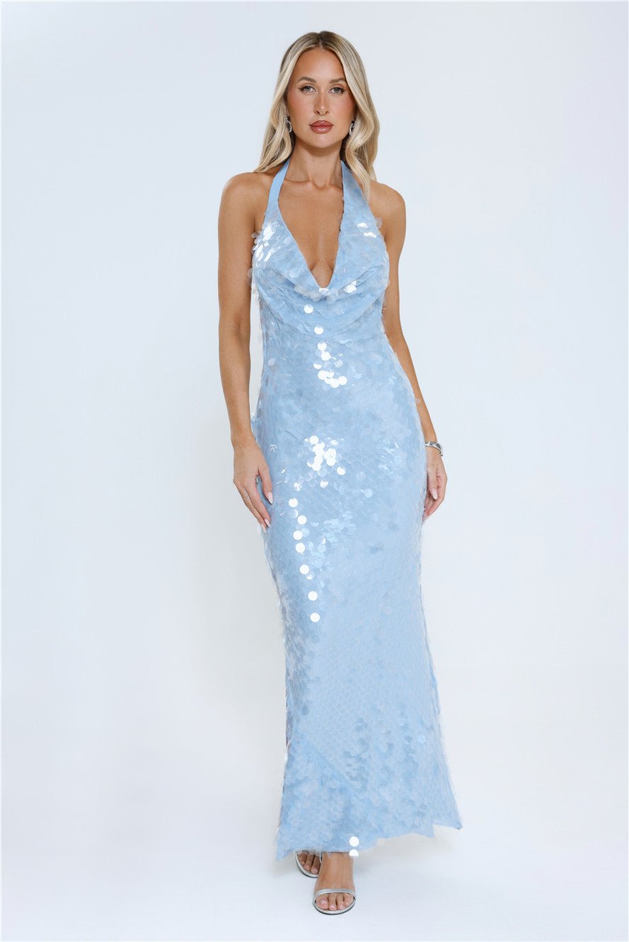 Make waves in the Oceanic Sequin Halter Maxi Dress. Featuring a cowl neck, halter design, and big clear sequins that sparkle with every movement, this dress combines glam with effortless elegance. The straight, flowy skirt and open back add drama and fluidity, making it perfect for unforgettable nights. Style it with strappy metallic heels and a sleek clutch for evening glam.