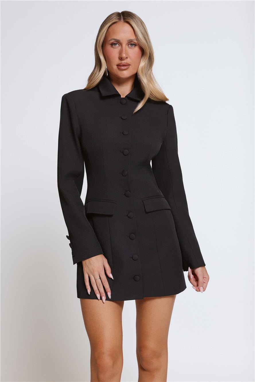 Channel timeless sophistication with the Preppy Perfection Tailored Long Sleeve Mini Dress. Featuring a structured, tailored fit, self-covered buttons, front pockets, long sleeves, and a classic collar, this dress blends polished elegance with modern charm. Style it with boots and a structured handbag for a chic day look, or add statement earrings and heels for an elevated evening ensemble.