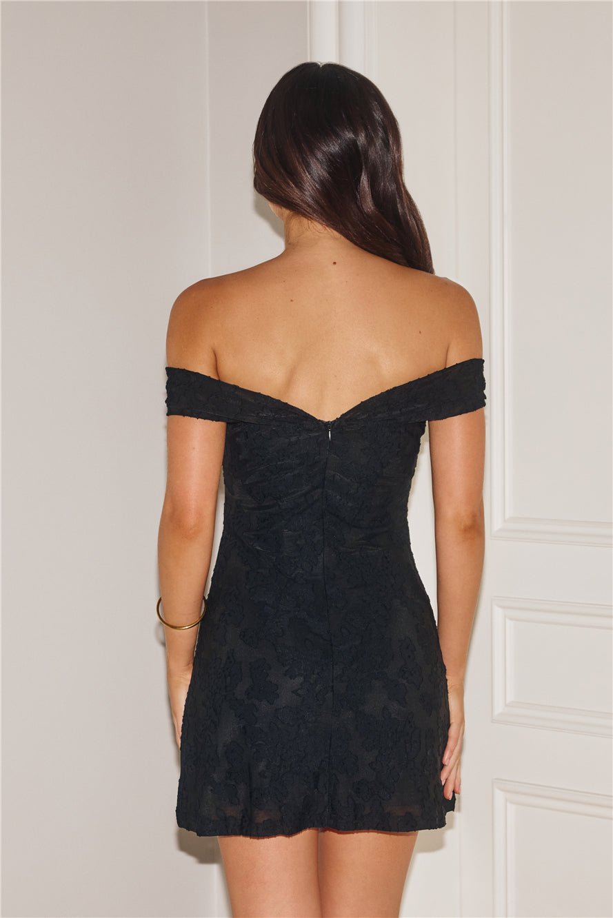 Be seen and admired in the Subtle Music Off Shoulder Mini Dress. Featuring a tie to the neckline, a textured pattern and a flowy skirt. Style with heels for all the likes. Â