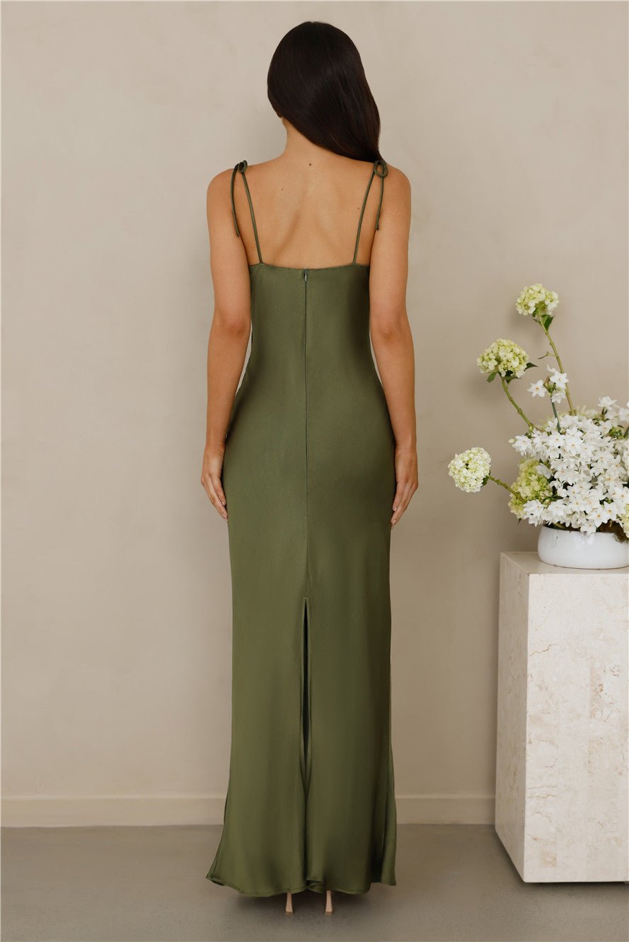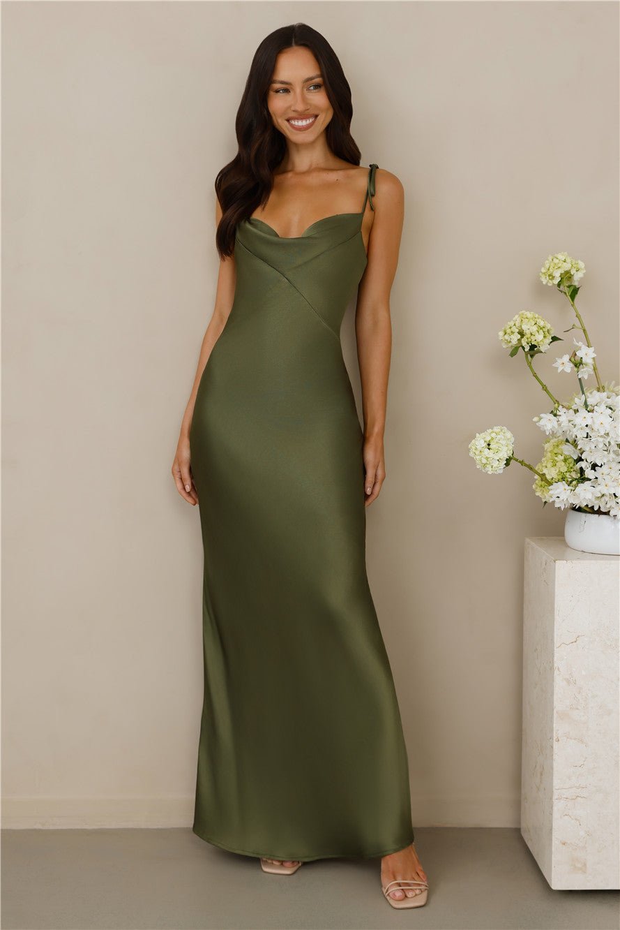 Crafted from luxurious satin, this dress showcases opulence and grace at its best. Featuring a cowl neckline that drapes with effortless allure, adding a touch of refined glamour to the look. Accentuating the shoulders are delicate tie-up straps, a charming detail that lends a hint of whimsy to the classic design.